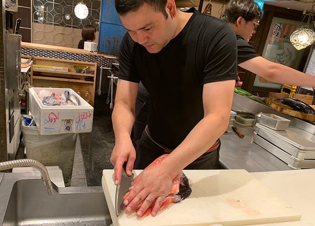 私は現在、有楽町にある居酒屋「築地もったいないプロジェクト 魚治」にて、主にキッチン業務を担っています。