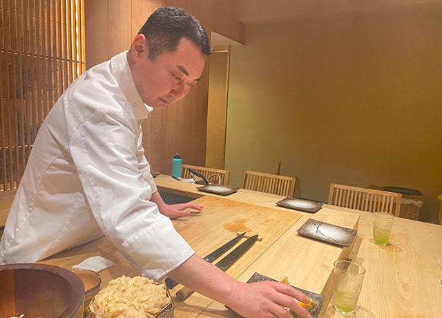 店舗運営というのは、チームワークで成り立つものです。各メンバーの仕事を自ら経験しなければ、自分の持ち場以外のポジションで働く仲間の気持ちは理解できません。店が忙しいときにも、相手の仕事を知っていれば的確な指示が出せるし、何を手伝えば仲間が助かるのかも分かるのです。特に料理人というのは、どうしても調理の技術に走ってしまいがちです。昨今の飲食業界は分業が進んでおり、料理人として入社すると、接客の経験をせずに調理場に入るケースがほとんどです。それではホールで働く仲間の気持ちはもちろん、お客様の目線も見落としてしまいます。私は最初の就職先が町場の鮨屋だったので、ホールや洗い場、出前など、店の仕事はすべて経験しました。ホテルに転職後も、トーションの扱い方をはじめ、ホールの仕事を自ら率先して学んだのです。ホテルは業務が完全に分かれているので、調理の人間がサービス業務を経験する機会はありません。だから、ホテルから転職してくる料理人の後輩には、教えることがたくさんあるのです。たとえば納品された瓶ビールの底を、きちんと拭いてから冷蔵庫にしまうこと。お客様に提供する際にはラベルを正面に向けること。いずれも当たり前の小さなことではありますが、ホール業務の経験がなければ、なかなか意識できないものです。今や食材知識や調理技術だけで勝負できるほど、料理人にとって甘い時代ではなくなりました。MUGENには、サービス業務の経験をはじめ、数字管理や集客、マネジメントなど、料理人としての総合的な力を養える環境があります。自分の将来的な価値を高めたいと思う人には、絶好の機会になるはずですよ。